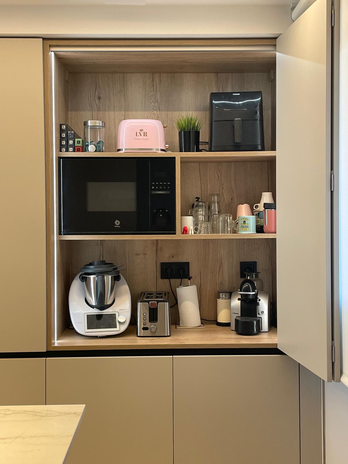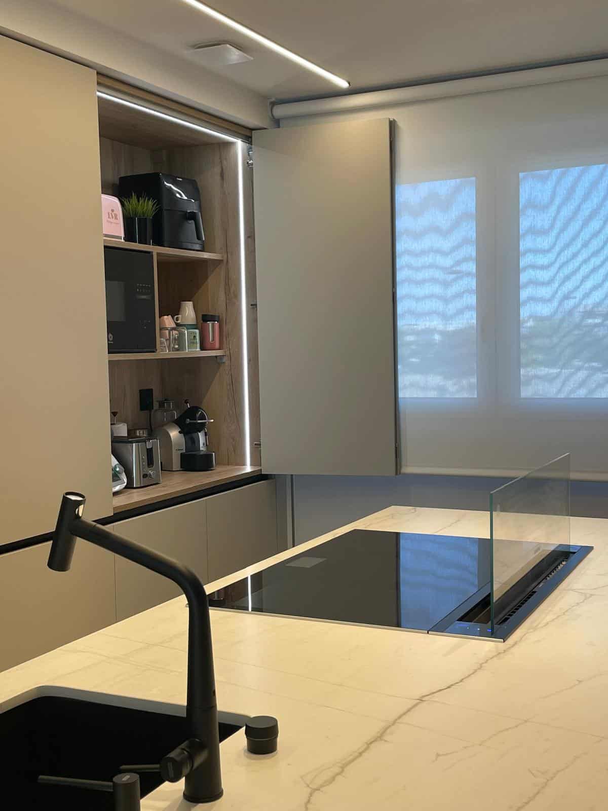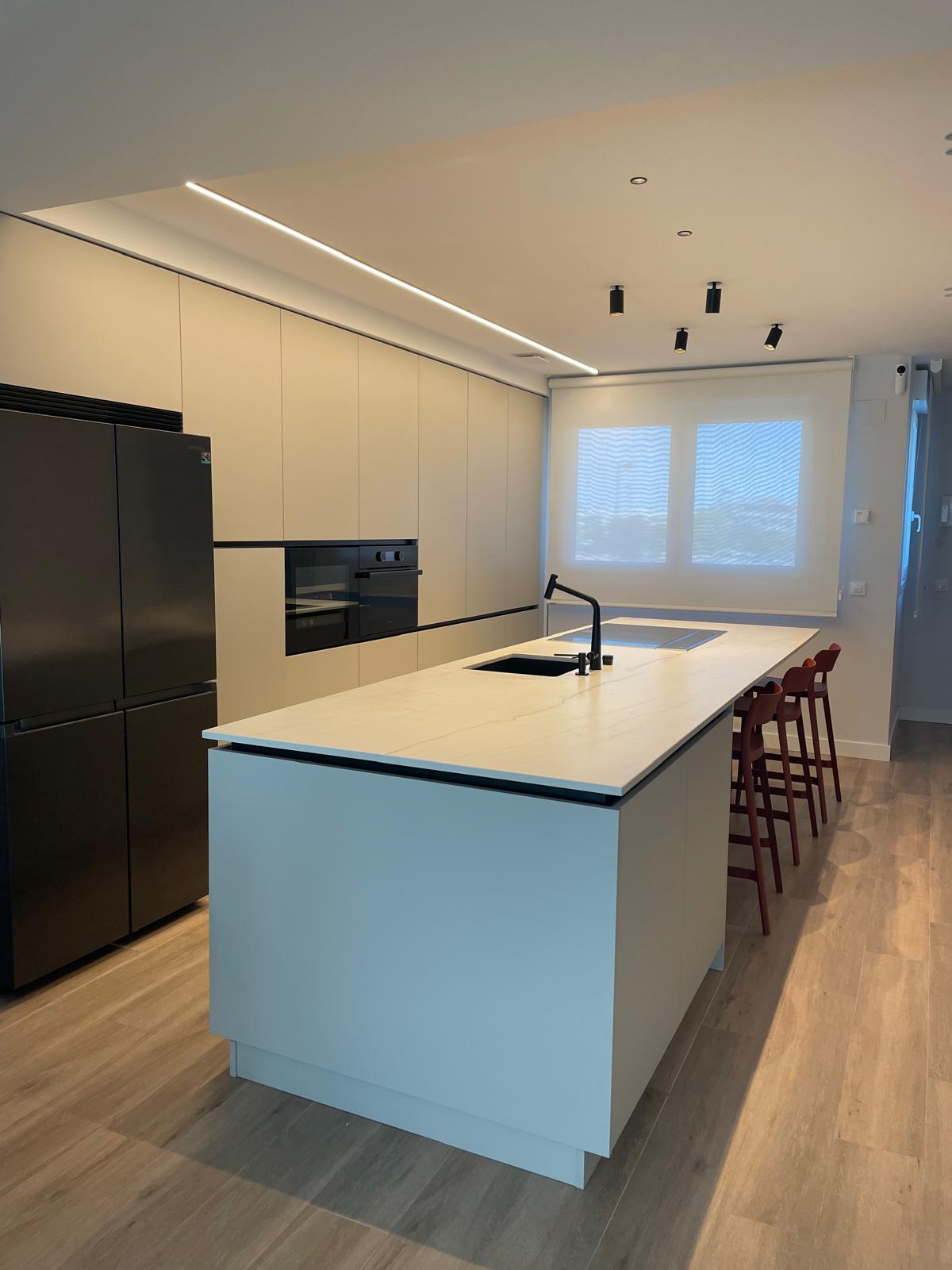 Los muebles cuentan con tiradores gola integrados en color negro, proporcionando un diseño minimalista y elegante que complementa perfectamente el laminado mate. Esta solución no solo es estéticamente agradable, sino que también es funcional, permitiendo un fácil acceso a todos los compartimentos.