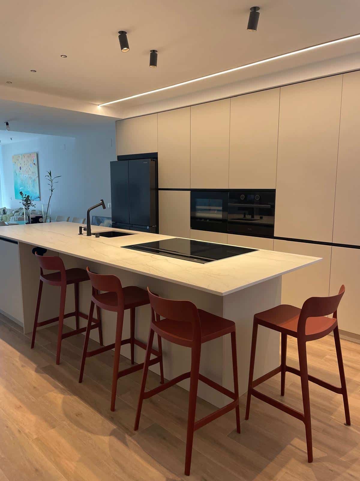 El resultado final es una cocina moderna y funcional que combina estética y practicidad. Cada elemento ha sido cuidadosamente seleccionado para ofrecer un espacio armonioso y eficiente, adaptado a las necesidades de los residentes de esta promoción de obra nueva en Getafe.