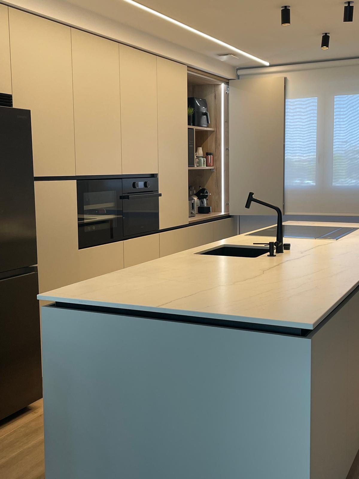 La encimera de esta cocina es uno de los puntos fuertes del diseño. Hemos optado por el modelo Montblanc de Neolith, un material porcelánico de 20 mm de espesor que combina resistencia y belleza. Este material es ideal para encimeras de cocina debido a su alta resistencia a las manchas, arañazos y calor, además de su fácil limpieza.