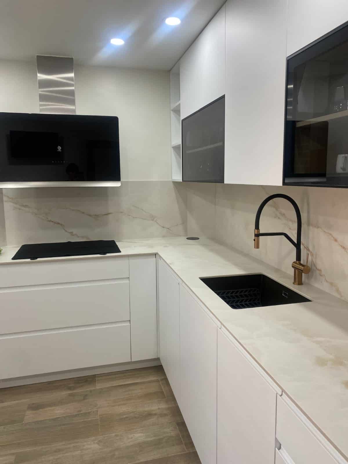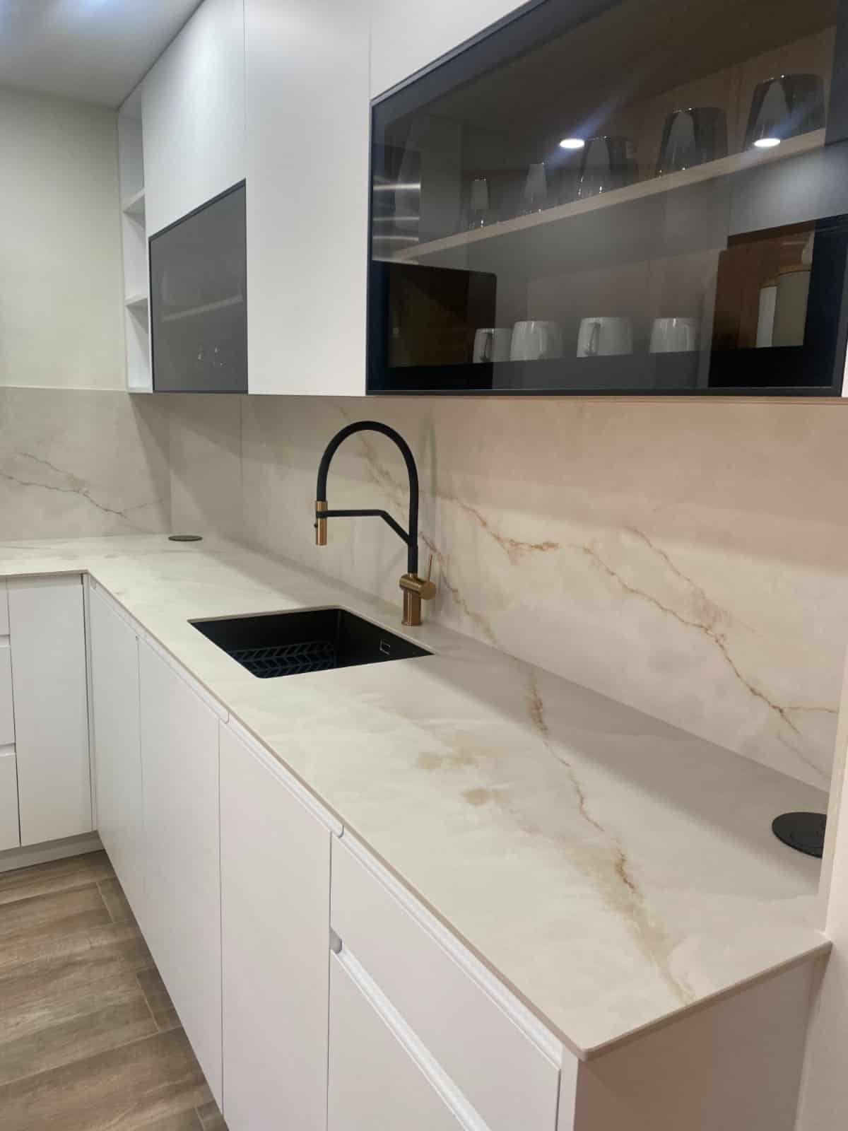 El punto central del diseño es la encimera Ascale Onice Luxe White, un material porcelánico de alta gama que destaca por su durabilidad y su acabado elegante.
