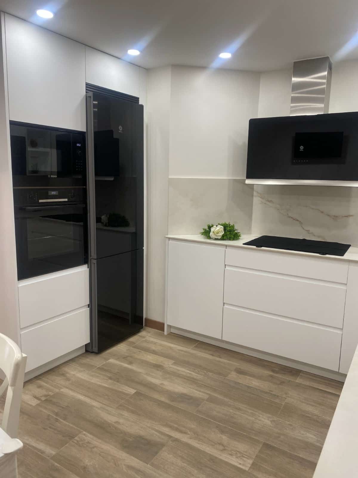 La funcionalidad y el diseño se integran de manera perfecta con los electrodomésticos de las gamas cristal Bosch y Balay, reconocidos por su tecnología avanzada y eficiencia energética. Sus acabados en cristal aportan una textura contemporánea que complementa a la perfección el diseño general, manteniendo la armonía estética de la cocina.