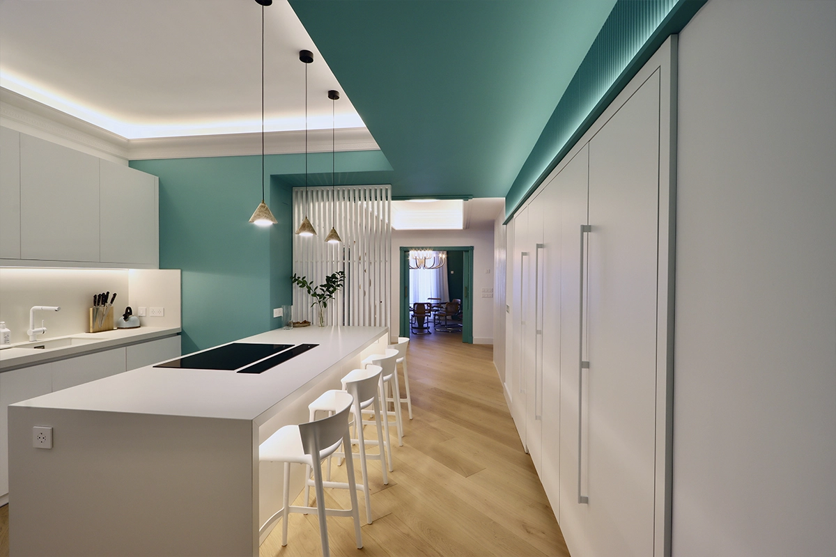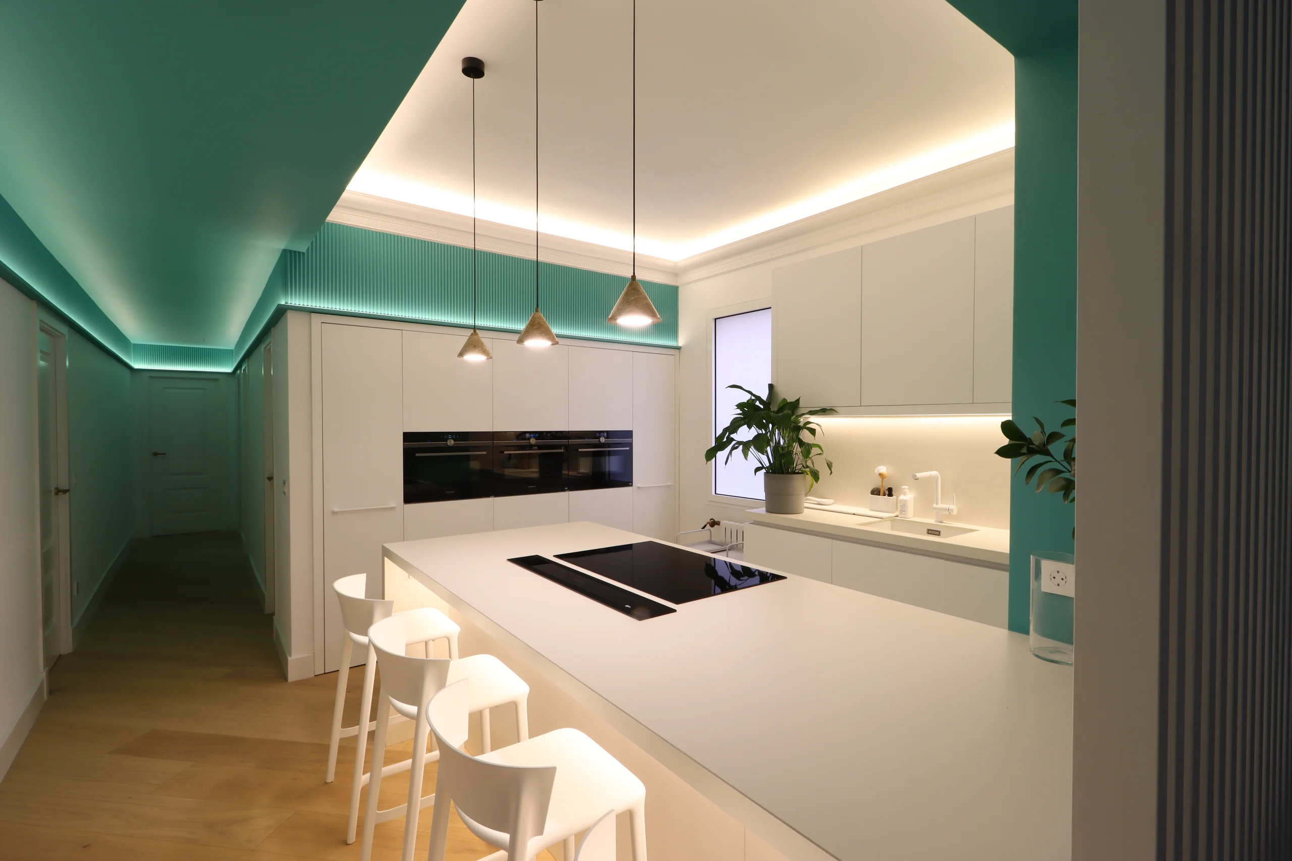 La iluminación ha sido cuidadosamente diseñada para resaltar los elementos clave de la cocina.