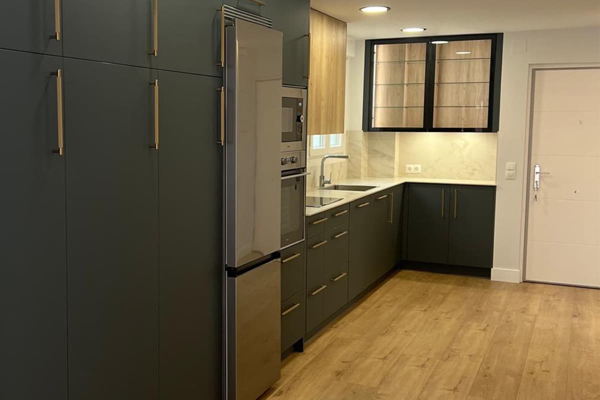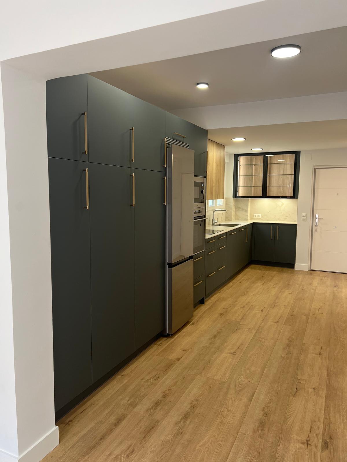 Los tiradores dorados destacan sobre el verde fénix y el laminado en madera, aportando un toque de brillo y lujo sin recargar el diseño.