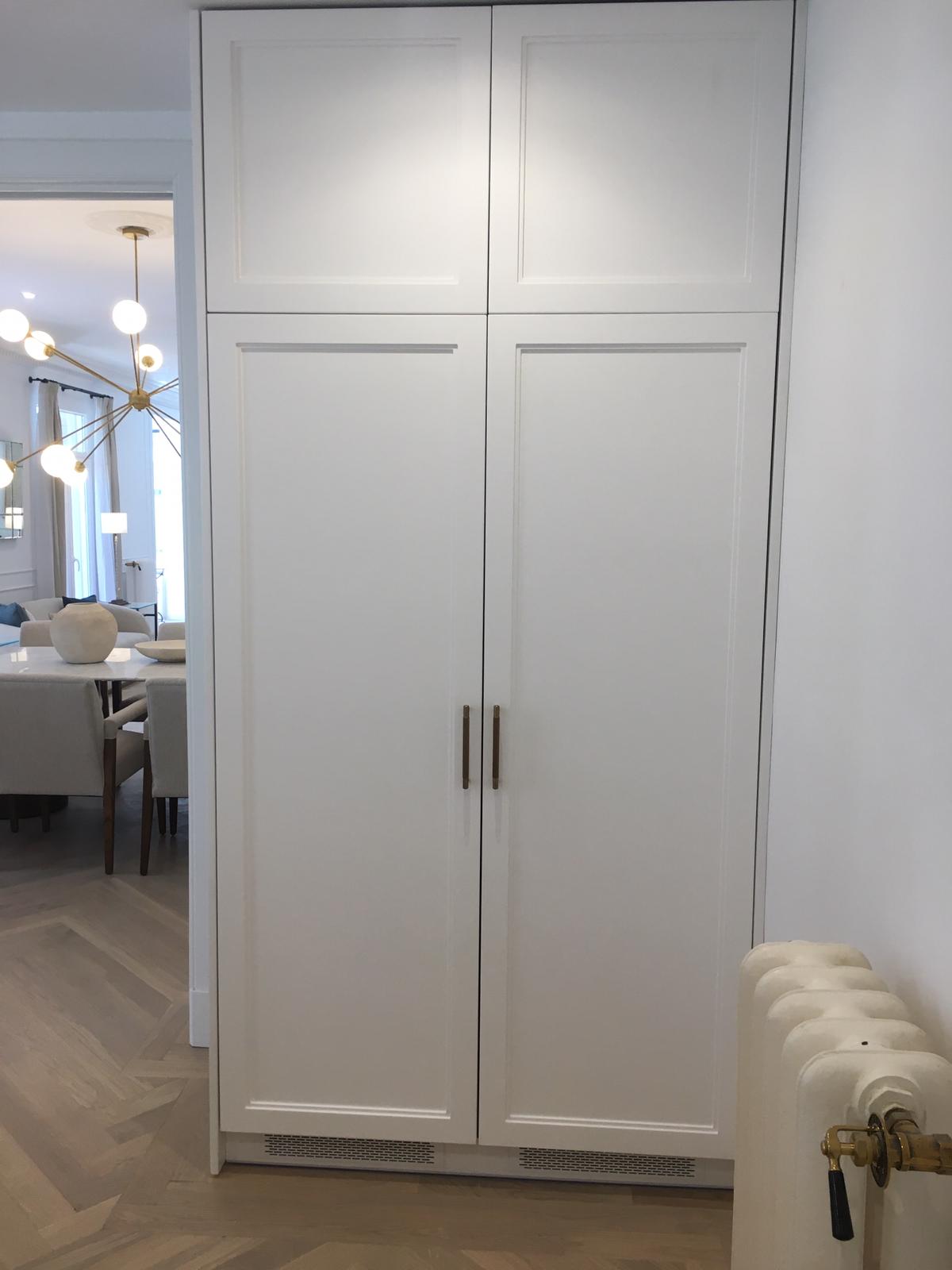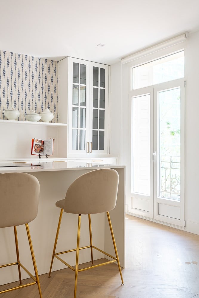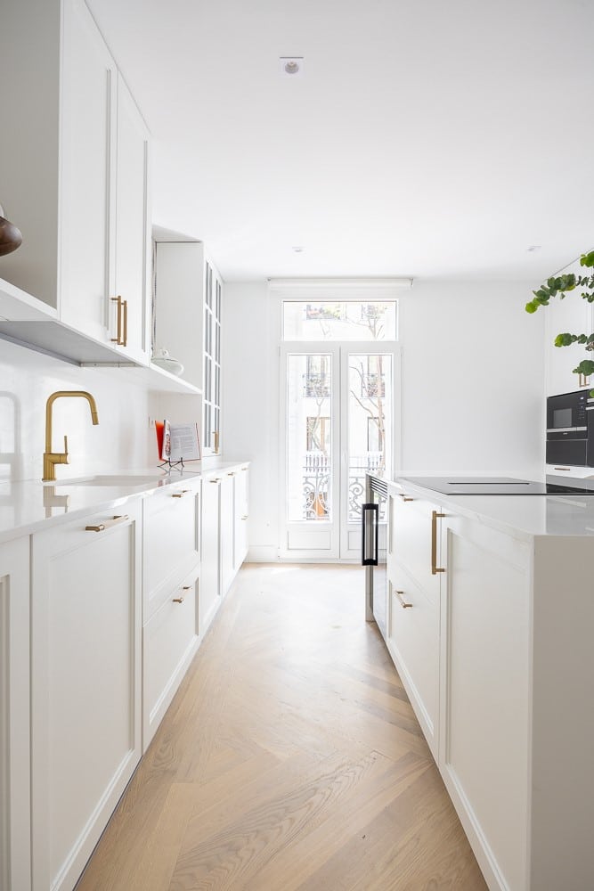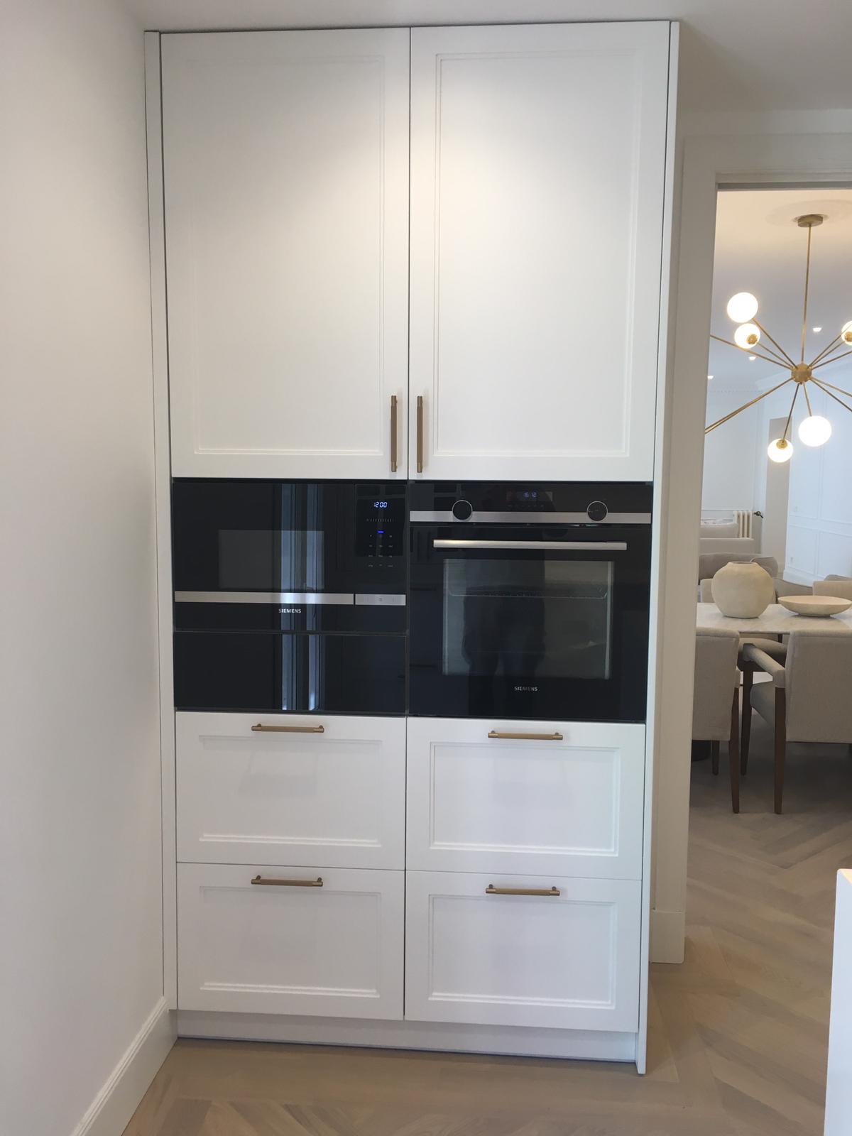 - Frentes de cocina: para los frentes de cocina, hemos optado por puertas lacadas con un elegante tirador asa en color bronce. Esta combinación proporciona un aspecto sofisticado y atemporal que se integra perfectamente con el diseño general de la cocina.