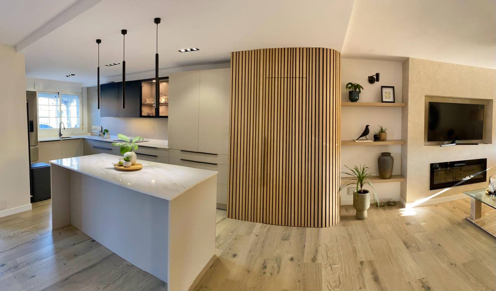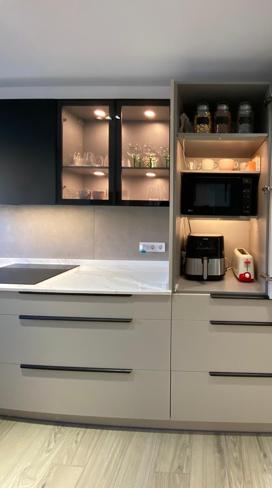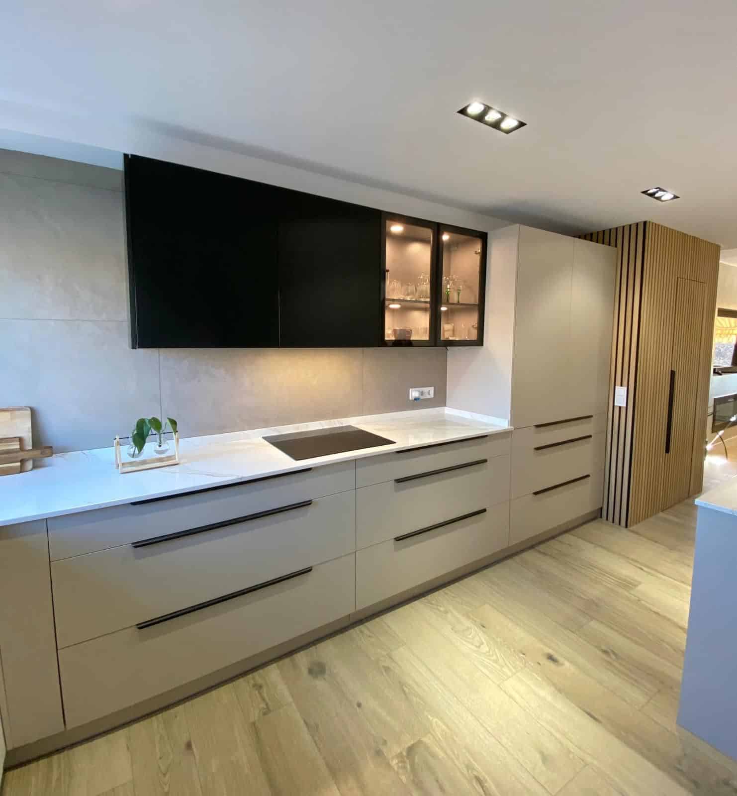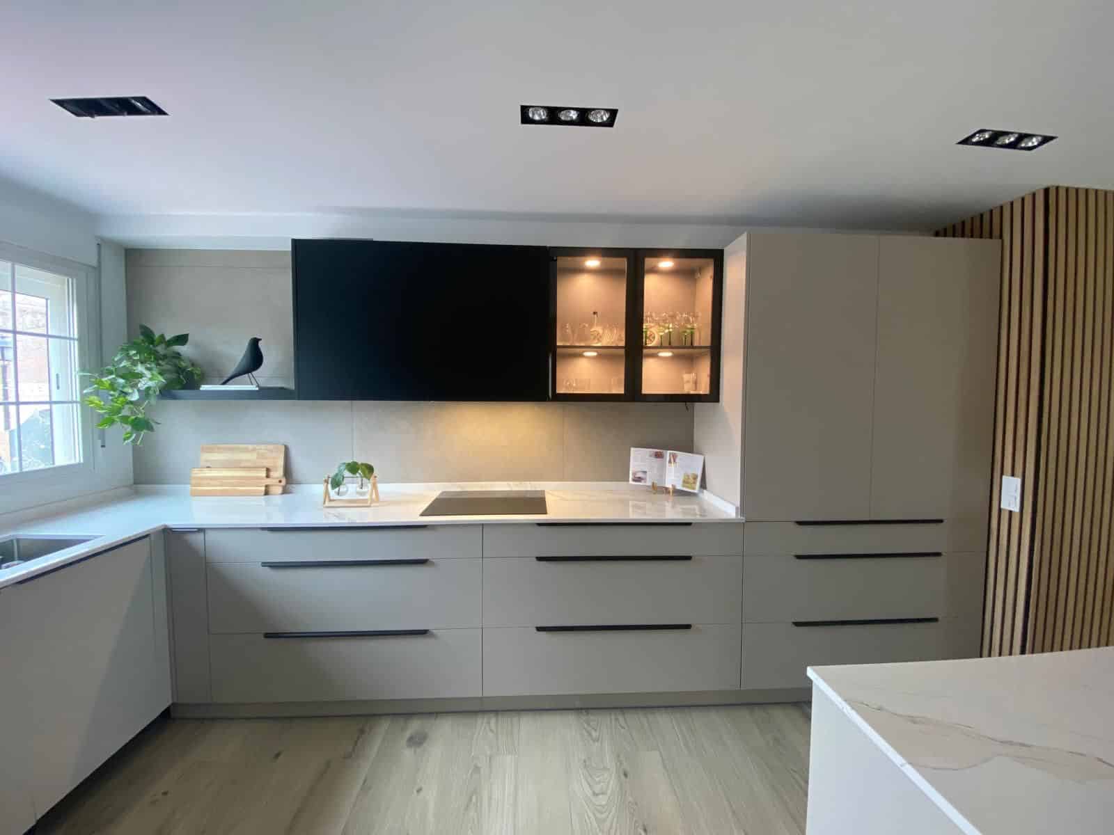- Mobiliario laminado mate en color taupe: los muebles de la cocina están fabricados en laminado mate de color taupe, que añade calidez y elegancia al ambiente. El tirador tipo pestaña en negro contrasta perfectamente con el tono suave del laminado, añadiendo un toque de modernidad al diseño.